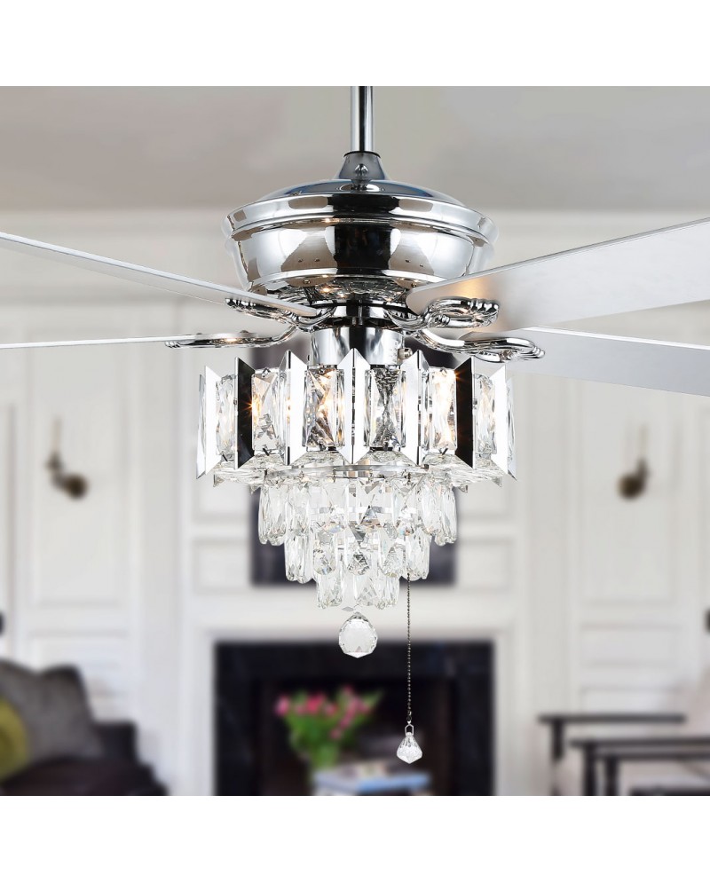 Add a captivating charm to your decor with this crystal ceiling fan. This ceiling fan light is a modern ceiling fan and crystal chandelier 2 in 1. The classic fan design completes the look with sparkling crystals and chrome matte black finish. This crystal ceiling fan is a very stylish and cost-effective option with five reversible wooden blades that lower the temperature in summer to push stale air out of the room, and push warm air down to keep the interior warm in winter. This chandelier ceiling fan light is the perfect solution for your fan and lighting needs.