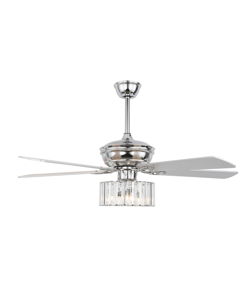 Add a flair of simplicity and elegance to a home space with this industrial-style ceiling fan light. This ceiling fan lamp has a bright chrome finish and looks great with a simple cage shade. The crystal lampshade is very beautiful under the light. Five reversible vanes allow the room to enjoy circulating air all year round. There is a 3-speed motor to select the desired fan speed. The included remote control can control the fan and light individually, and any function of the fan light makes life more convenient. Create a room with style, sparkle, and grandeur with this crystal ceiling fan.