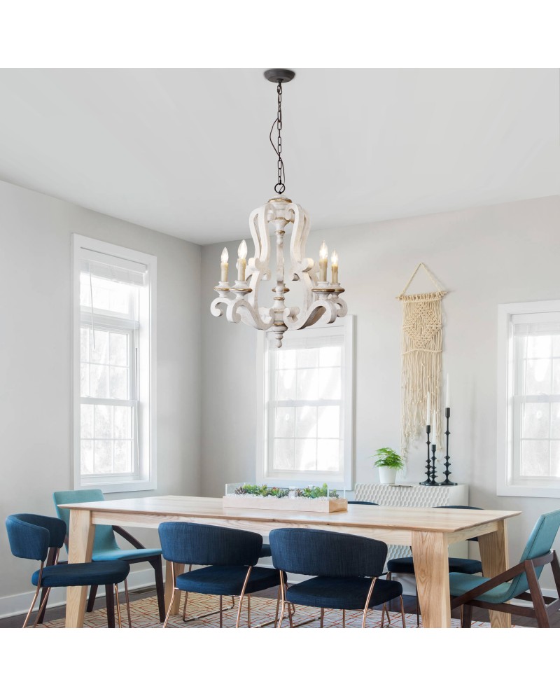 Boosts a retro style with the antique distressed white color finish chandelier. Bring cottage chic style to your room interior with this wood and metal farmhouse chandelier pendant light. The perfect combination of wood and metal, fully expressing unique style and practical durability, perfectly blends with your retro home style. Candelabra base with five E12 lamps (bulb not included) brings soft lighting and a warm atmosphere to your space. Enjoy a cozy setting and a delicious dinner with your family at the end of a busy workday.