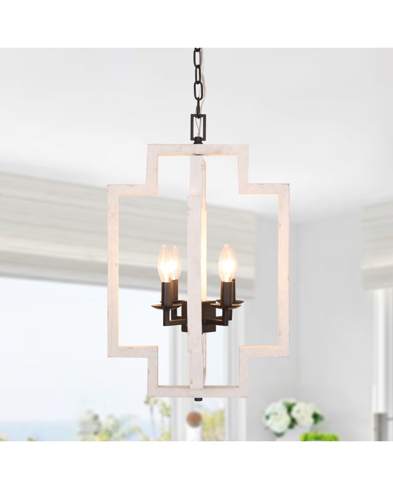 Farmhouse Black Metal Finish Wood Chandelier Adjustable Chain Pendant Light, Weathered Wood, Distressed White