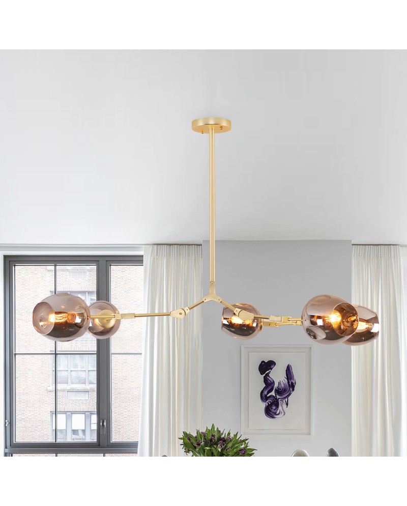 Bring sparkling style to your decoration with this charming pendant light. This chandelier pendant light is made of high-quality glass lampshade, with soft and even light transmission, which makes the light charming and elegant, creating a healthy and comfortable lighting environment for your space. With the blessing of five bulbs (not included), you can get enough light in the dark. Lampshades of different colors add more vitality to your home decoration and make you enjoy life more. The metallic look also gives a contemporary look to the pendant light fixture, perfect for kitchen islands and hallways, and more. If you are looking for a modern pendant light, this 5-light pendant light is your best choice!