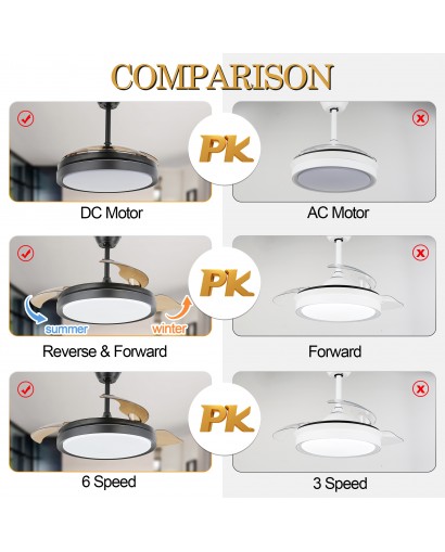 Illuminate your home with this DC motor ceiling fan. Compared to the traditional AC motor, this upgraded DC motor ceiling fan with light has more functions and more energy efficient than traditional AC motor. The 6-speed noiseless motor provides a super powerful current and a comfortable sleeping environment. Ideal for small to medium-sized interior rooms such as living rooms, bedrooms, dining rooms, etc. The dimmable mode gives you the light that best suits the current environment. All functions can be controlled by the included remote control to make your life easier. Reversible blades keep the fan functioning all year round, and clockwise rotation in summer keeps the room cool. In winter, the counterclockwise rotation pushes the warm air downward to keep the interior warm. Enjoy circulating air all year round.
