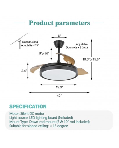 • Package Includes: Ceiling Fan with Light, Remote Control, Installation Manual, 2 Downrods (L5" and L10")