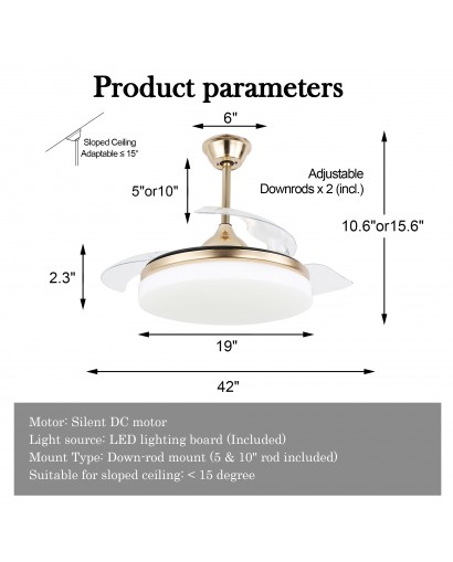 • Package Includes: Ceiling Fan with Light, Remote Control, Installation Manual, 2 Downrods (L5" and L10")