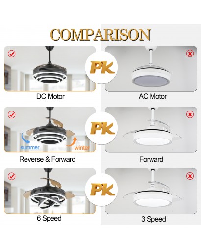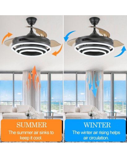 Promote air circulation around the room for a cozy living atmosphere with this multifunctional ceiling fan. The retractable fan blades extend when the fan is on and shrink when the fan is off, saving you more space. The blades are not easy to collect dust, if you want to clean the fan blades, there is no need to disassemble the ceiling fan, just stretch the fan blade and wipe it with a towel. Dimmable LED light, which has ribbon shape light source and can be changed through the remote control. All functions can be controlled by the included remote control to make life more convenient. The reversible blades can also be used with air conditioners in winter, which push the rising air downward and enjoy the air circulating in the room.