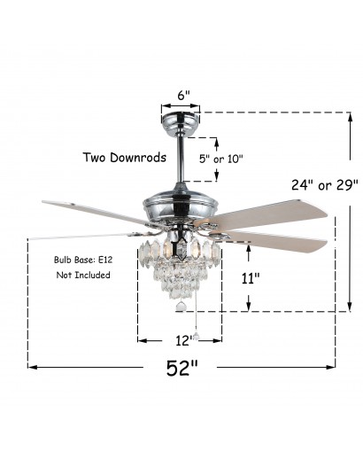 Provide a luxurious and splendid interior to your home space with this crystal ceiling fan. With the 3-speed adjustable (high, medium, low) and high-quality motor runs smoothly without noise, giving you a quiet and comfortable environment. Equipped with 5 reversible blades to change the wind direction as needed, turning forward in summer to enjoy cooler winds and reversed in winter to help recirculate warm air. Comes with two different sizes of down rods (5" and 10") and hangs at the desired height, which is compatible with sloped ceilings (max angle: 15°).