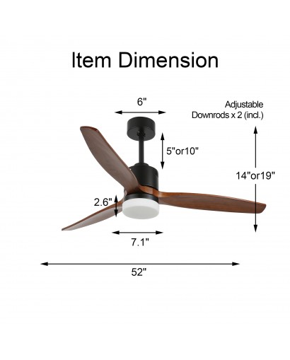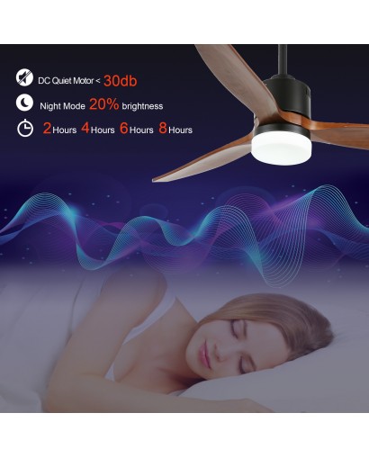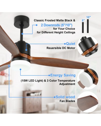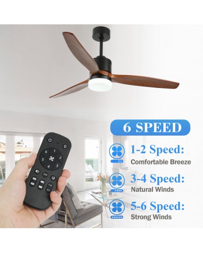 Present a sleek retro design with the matte black finish and the brown premium solid wood fan blades, perfect for any indoor and covered outdoor space, living room, bedroom, or patio. This ceiling fan light is a combination of ceiling fan and light, both can work independently. Including LED lights, three color temperature adjustable, 3000K warm light, 4000K natural light, 6500K white light, and 0%-100% brightness adjustment, can save energy and money. The included remote can turn on/off the ceiling fan or lights independently, and all functions such as adjusting the fan speed from low to medium to high can be controlled by the remote. DC motors are quieter and last longer than traditional AC motors. Quiet performance provides you with a quiet and comfortable sleeping environment.