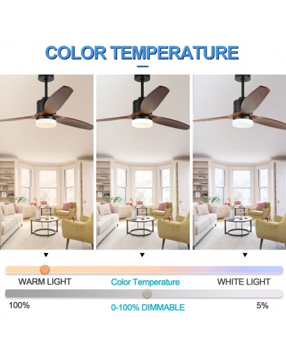 Dimmable LED Light: LED ceiling fan is dimmable. The power of light is 15W. Color temperature is 3000K/ 4000K/ 6000K. 0%-100% dimmable brightness.