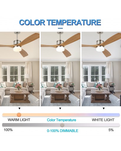 Dimmable LED Light: LED ceiling fan is dimmable. The power of light is 15W. Color temperature is 3000K/ 4000K/ 6000K. 0%-100% dimmable brightness.
