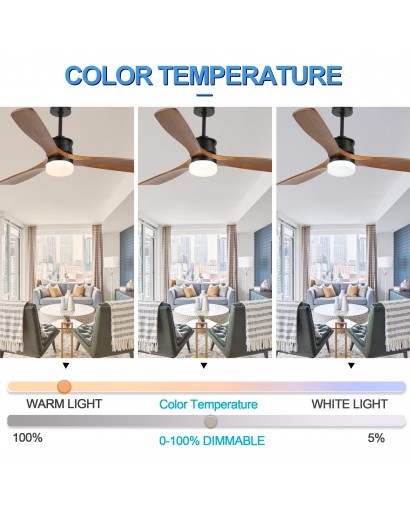 Dimmable LED Light: LED ceiling fan is dimmable. The power of light is 15W. Color temperature is 3000K/ 4000K/ 6000K. 0%-100% dimmable brightness.