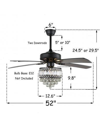 Create a gorgeous and wonderful home atmosphere for your room space with the luxurious crystal ceiling fan. This ceiling fan light features three fan speeds and reversible blades for all-year-round comfort. The reversible fan blades cool the air evenly by rotating clockwise, keeping the room cool in the summer. During the cold winter, the fan blades can rotate counterclockwise to push the warm air downward to keep the room warm. The near-silent motor runs smoothly and provides a comfortable sleeping environment. Three E12 bulbs (not included) are required to light up your room and create a warm atmosphere for you to enjoy a delicious dinner with your family and friends under the soft light after busy work.
