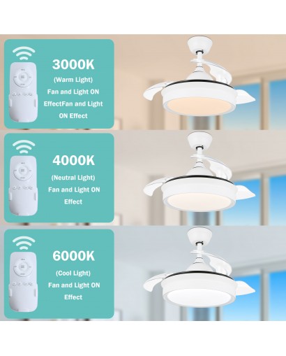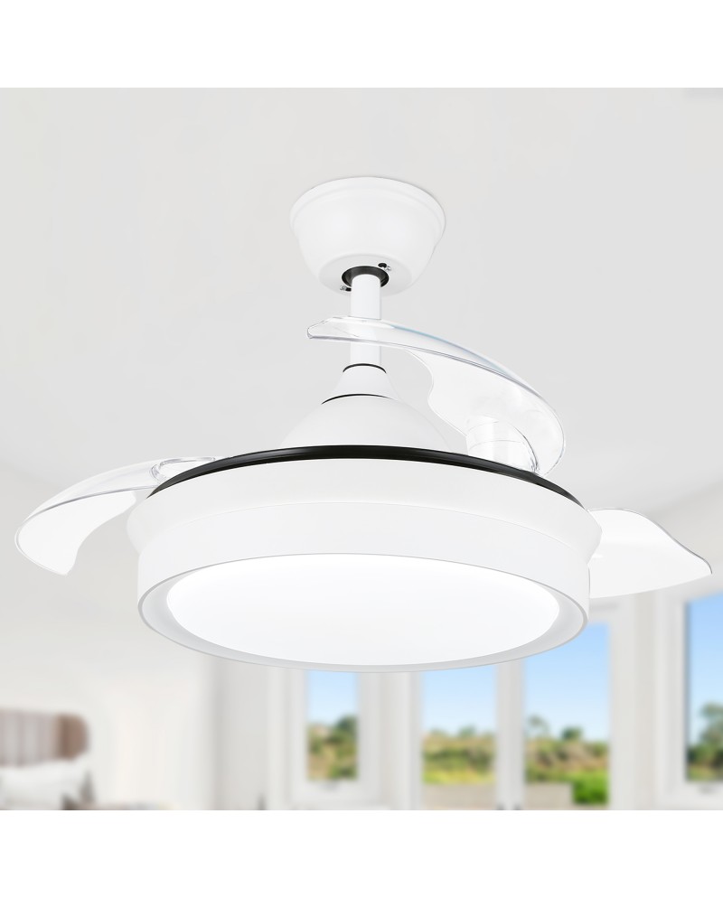 Enjoy a fresh breeze with this contemporary ceiling fan. This modern ceiling fan features retractable blades that save space and don't trap dust for easy cleaning. The blades automatically extend when you turn on the fan, and retract when the fan is turned off. Includes integrated LED lights to help provide ambient lighting and save on electricity bills. 3-speed motor and CCT dimming, giving you a quiet and comfortable living environment. This ceiling fan is perfect for living room, bedroom, kitchen, dining room, and more.