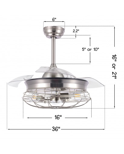 Give this ceiling fan a striking industrial look with the cage design. This ceiling fan features 3 retractable blades, the transparent ABS blades automatically hide when you turn off the fan and automatically expand when you turn the fan on. This ceiling fan includes 2 down rods (5" and 10"), you can choose the length you want. 3-speed and complete remote control functions fans and lights can be controlled separately. Requires 3 E26 Basic Bulbs, Edison Bulbs / LED / CFL / Incandescent (bulb not included) to light up your room. 3-speed and almost silent motor gives you a comfortable living environment.