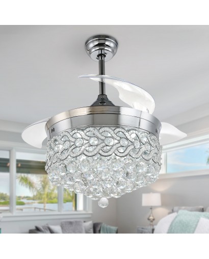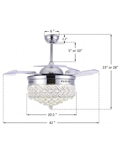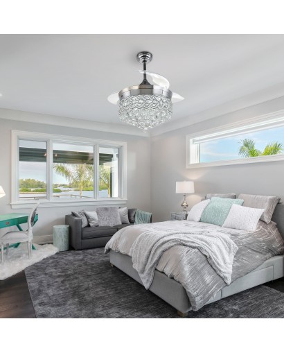 Give a luxurious and elegant accent to your home space with a 42-inch gorgeous crystal ceiling fan. This ceiling fan features a crystal shade to keep the room full of light, giving your room a luxurious interior. The retractable blades open when the fan is on, and shrink when the fan is off, reducing space usage. Equipped with two different sizes of down rods (5 inches and 10 inches), you can adjust the desired high independently. The multifunctional ceiling fan light guarantees a comfortable home experience.