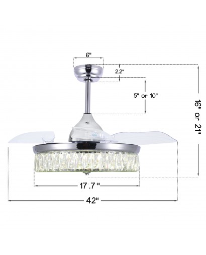 Lighten up your home space with a luxurious modern-style crystal ceiling fan. This ceiling fan is CCT dimmable light, it has 3 light tones, please turn off the light and then turn it on again, and the light tone will change. After busy work, please enjoy a comfortable living environment with soft lighting. The retractable fan blades are made of high-quality acrylic, which is stretched out when the fan starts to operate and retracted when the fan is closed, which is not easy to accumulate dust. Provide endless convenience to life with this ceiling fan with remote control.