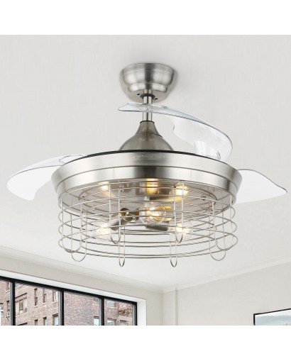 Industrial Glam 42-In Retractable 3-Blade Ceiling Fan Caged Shade Chandelier with Remote Control, Black, Nickel