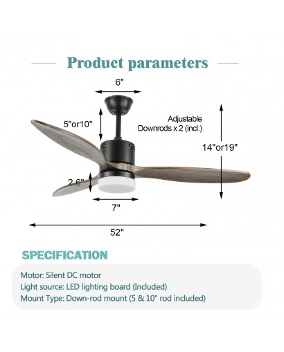 - Package Includes: Ceiling Fan with Light, Remote Control, Installation Manual, 2 Downrods (L5" and L10")