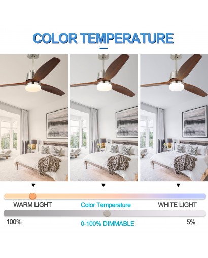 - Dimmable LED Light: LED ceiling fan is dimmable. The power of light is 15W. Color temperature is 3000K/ 4000K/ 6000K. 0%-100% dimmable brightness.
