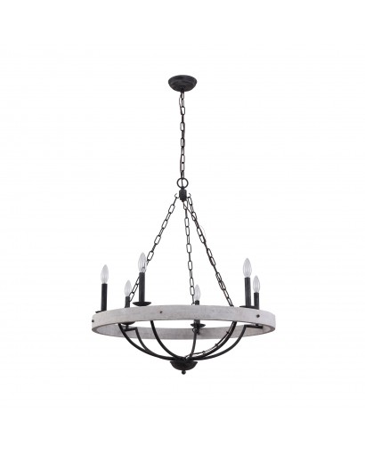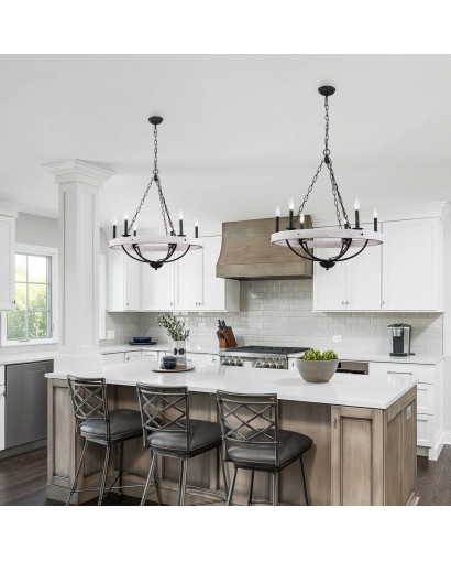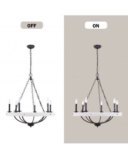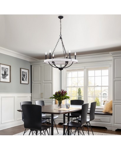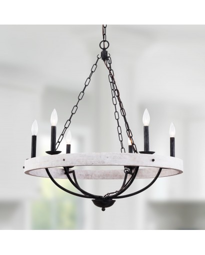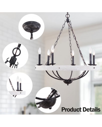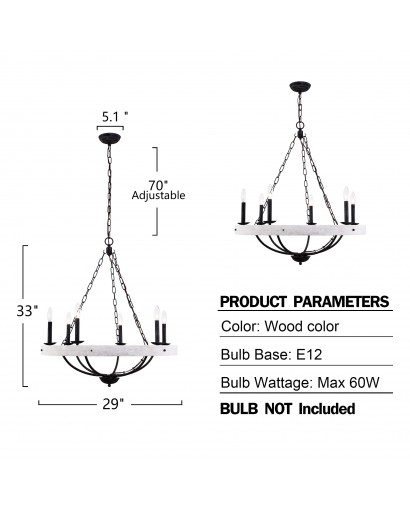 Brighten up your room with this farmhouse-style wood chandelier. Six black candlesticks need E12 bulbs (not included) to illuminate your room. After busy work, enjoy a delicious dinner with family and friends under the soft light, creating a warm and sweet atmosphere of life. Add a traditional and farmhouse feel to its horse-drawn carriage design with a round wood frame and metal base for this chandelier. The chain of the chandelier is adjustable to accommodate ceilings of various heights. This rustic wooden chandelier will make a great addition to your living room, dining room, or foyer.