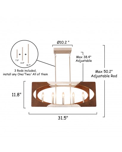 Provide ample illumination to your room with this farmhouse-style chandelier. This 5-light chandelier has a transitional design with constructed clean lines and a rectangular frame. Come with three different sizes of down rods(7.8-inch, 11.8-inch, 18.7-inch), which install any one/ two/ all of them at your desired height. Perfect for a kitchen, dining room, living room, bedroom, foyer, hall, entry, or restaurant.